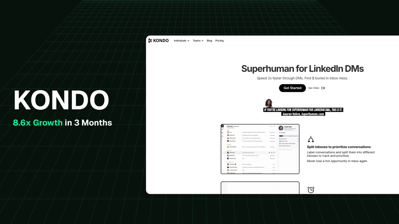 Kondo is a LinkedIn inbox managment tool built from its founder Mitchell’s frustration with missed messages. It behaves like Superhuman for LinkedIn—speedy, reliable, and never at risk of getting an account banned.