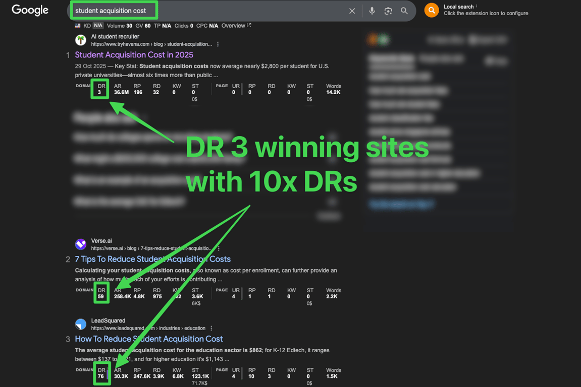 We recently published a report on how much it cost universities to recruit a student. They rank above established sites with more than 10x their authority.